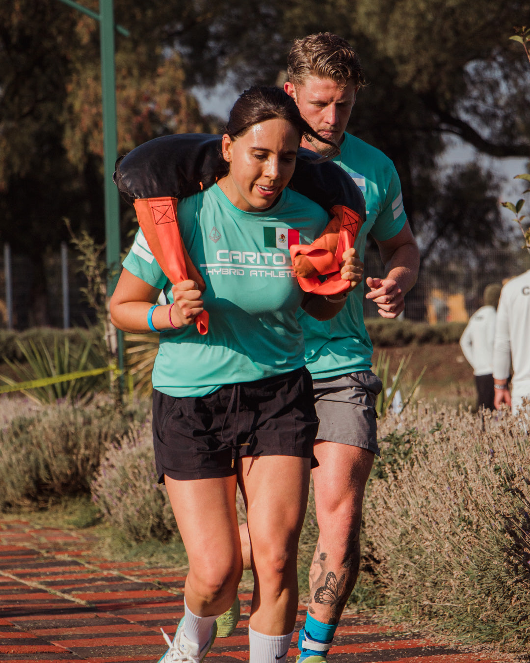 3. Transporte con saco de arena: recorrido con saco de arena de 100 m de ida + 100 m de regreso. (20 kg hombres, 15 kg mujeres).